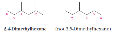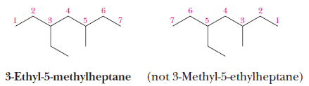 – If there are different substituents in equivalent positions on opposite ends of the parent chain, give the substituent of lower alphabetical order the lower number.