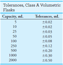 Volumetric flasks (see Figure 4) are manufactured with capacities ranging from 5 mL to 5 L and are usually calibrated to contain (TC) a specified volume when filled to a line etched on the neck.