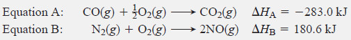 Equation B has twice the needed amounts of N2 and NO, and they are on the opposite sides from the target; therefore, we reverse Equation B, change the sign of ΔHB, and multiply both by :