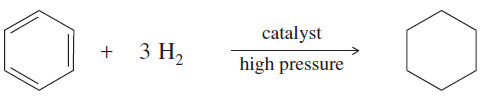 (4) Hydrogenation of benzene requires higher pressures of hydrogen and a more active catalyst. This hydrogenation is exothermic by 208 kJ mol (49.8 kcal mol), about 151 kJ (36.0 kcal) less than 3 times the value for cyclohexene.