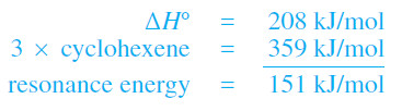 – The huge 151 kJ mol (36 kcal mol) resonance energy of benzene cannot be explained by conjugation effects alone.